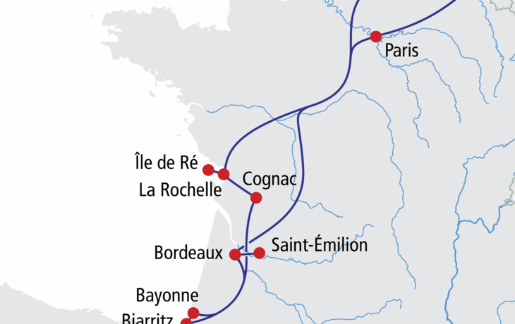 Die französische Atlantikküste fasziniert mit besonderen landschaftlichen, kulturellen und geschichtlichen Reizen. Zwischen dem Atlantik und den Pyrenäen erwartet Sie zudem ein mildes und sonniges Klima. Weite Sandstrände, die Weinberge des Bordeaux, Wälder und Seen machen diese Landschaft zu etwas ganz Besonderem. Entdecken Sie die kulturell bedeutende Stadt Bordeaux sowie die berühmten Küstenstädte La Rochelle und Biarritz und lernen Sie baskische Dörfer kennen. Freuen Sie sich auf Aha-Erlebnisse par excellence - vielfältig und atemberaubend!