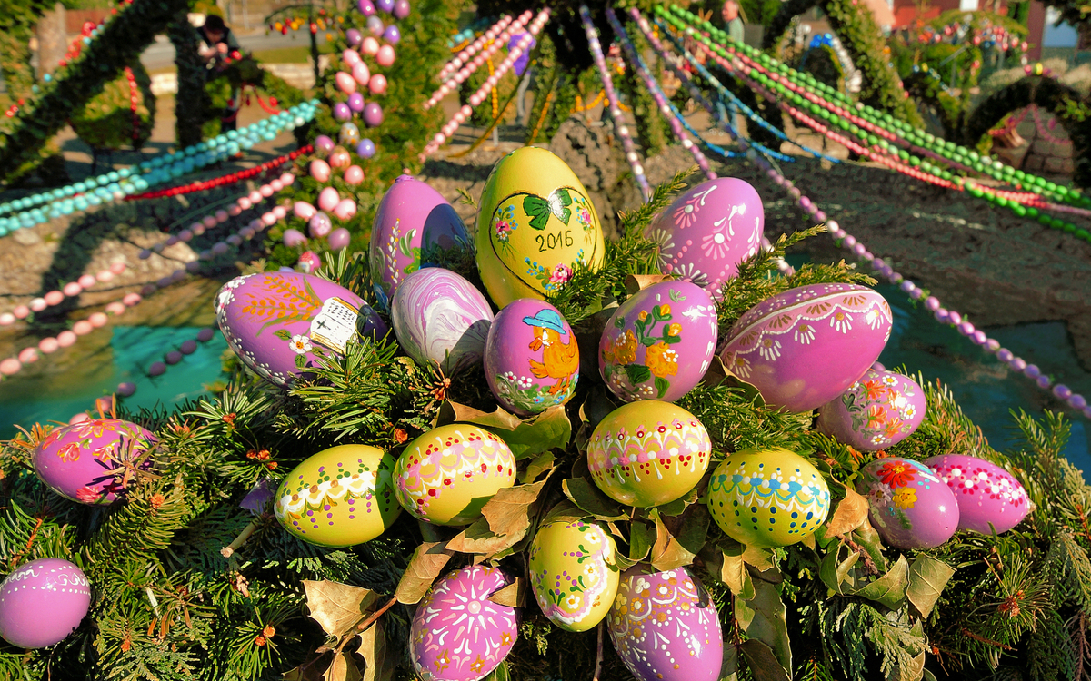Eine Station der Osterbrunnentour in die fränkischen Dörfer, in denen die bunt geschmückten Brunnen und Plätze in den schönsten Farben strahlen, ist Bieberbach, mit 11.000 Eiern der weltweit größte Osterbrunnen, der es ins Guiness Buch der Rekorde geschafft hat.