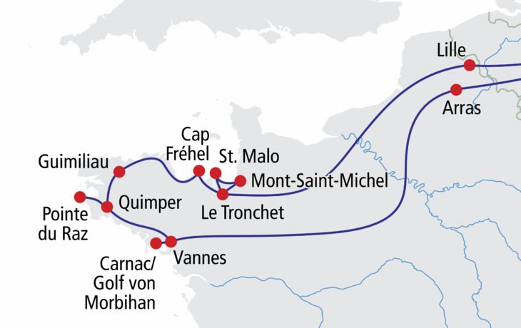 Weite Strände, wilde Küsten, imposante Landschaften, schroffe Felsklippen, idyllische Dörfer - die Bretagne gehört zweifelsohne zu einer der beliebtesten Urlaubsregionen Frankreichs. Machen Sie Bekanntschaft mit der herben und sagenumwobenen Landschaft, entdecken Sie die alte Korsarenstadt Saint-Malo, bewundern Sie wild zerklüftete Küstenlandschaften, treffen Sie auf Schauplätze vieler Sagen und Märchen sowie geheimnisvolle Steinsetzungen, eigentümliche Kalvarienberge und logieren Sie für zwei Nächte in einer ehemaligen Benediktinerabtei. Kurzum: Eine Reise mit einer Fülle von touristischen Attraktionen und, ob kulturell, historisch oder kulinarisch - die Vielseitigkeit der Bretagne wird auch Sie begeistern und verzaubern.