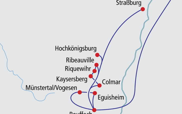 Genießen Sie das Elsass mit Leib und Seele und freuen Sie sich auf erlebnisreiche Tage im Herzen der ältesten Weinstraße Frankreichs. Weinberge so weit das Auge reicht, urige kleine Ortschaften mit jahrhundertealten blumengeschmückten Fachwerkhäusern, die sich wie Perlen aneinanderreihen, gemütliche Weinstuben, gastfreundliche Bewohner, Burgen, Berge und wunderschöne Täler - das Elsass ist mit Schönheiten der Natur und kulturellen Reichtümern so üppig gesegnet wie nur wenige Regionen. Überzeugen Sie sich selbst davon!