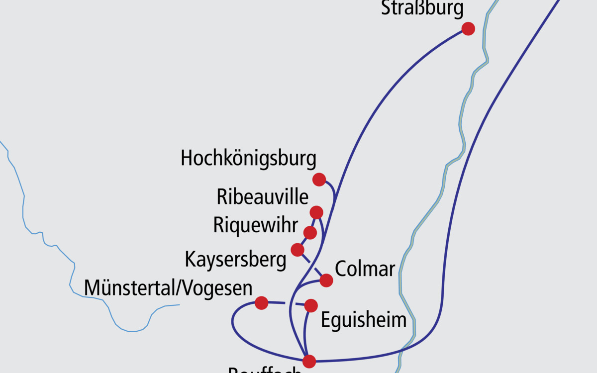 In Begleitung eines örtlichen Reiseleiters fahren Sie nach Colmar, der Perle der Elsässischen Weinstraße. Bewundern Sie den pittoresken mittelalterlichen Stadtkern mit seinen bunt bemalten und gut erhaltenen Fachwerkhäusern. Nach einem Rundgang haben Sie noch Zeit für eigene Erkundungen und eine individuelle Mittagspause. Im Anschluss entdecken Sie die Elsässer Weinstraße, die von unzähligen kleinen, idyllischen Dörfern gesäumt ist. Auf Ihrer Route liegen Kaysersberg, Riquewihr und Ribeauvillé. Natürlich darf ein Besuch bei einem Winzer mit Verkostung der edlen Tropfen, drei Weine der Region, nicht fehlen.