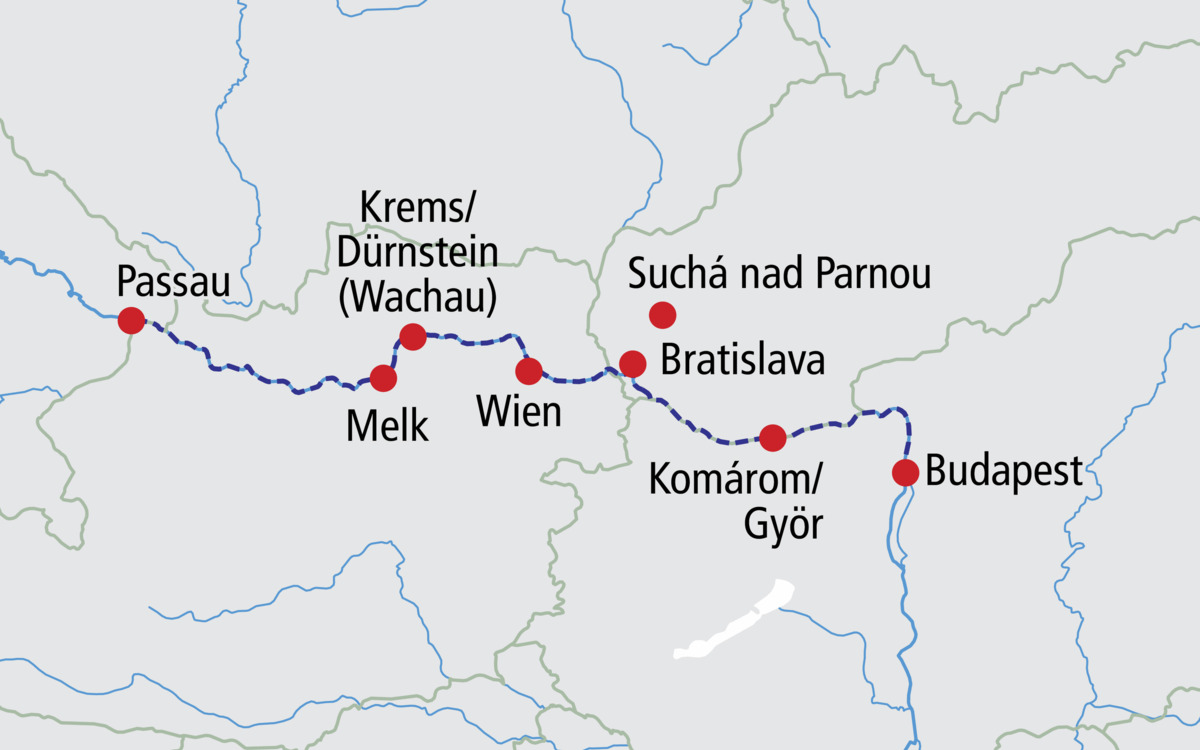 Erleben Sie unvergessliche Momente während Ihrer Reise auf dem zweitgrößten Fluss Europas, die Sie nach Budapest und Wien führt. Lassen Sie sich von den Prachtbauten in den Donaumetropolen beeindrucken und freuen Sie sich auf die zauberhafte Landschaft der Wachau und landschaftliche Vielfalt der Flussufer der Donau. Entdecken Sie auf Ihren Ausflügen die kulturelle Vielfalt der großen Städte, die kulturgeschichtliche Bedeutung sakraler Bauwerke und die Sehenswürdigkeiten abseits des großes Flusses wie die Barockstadt Györ und die slowakischen Weinbaugebiete.