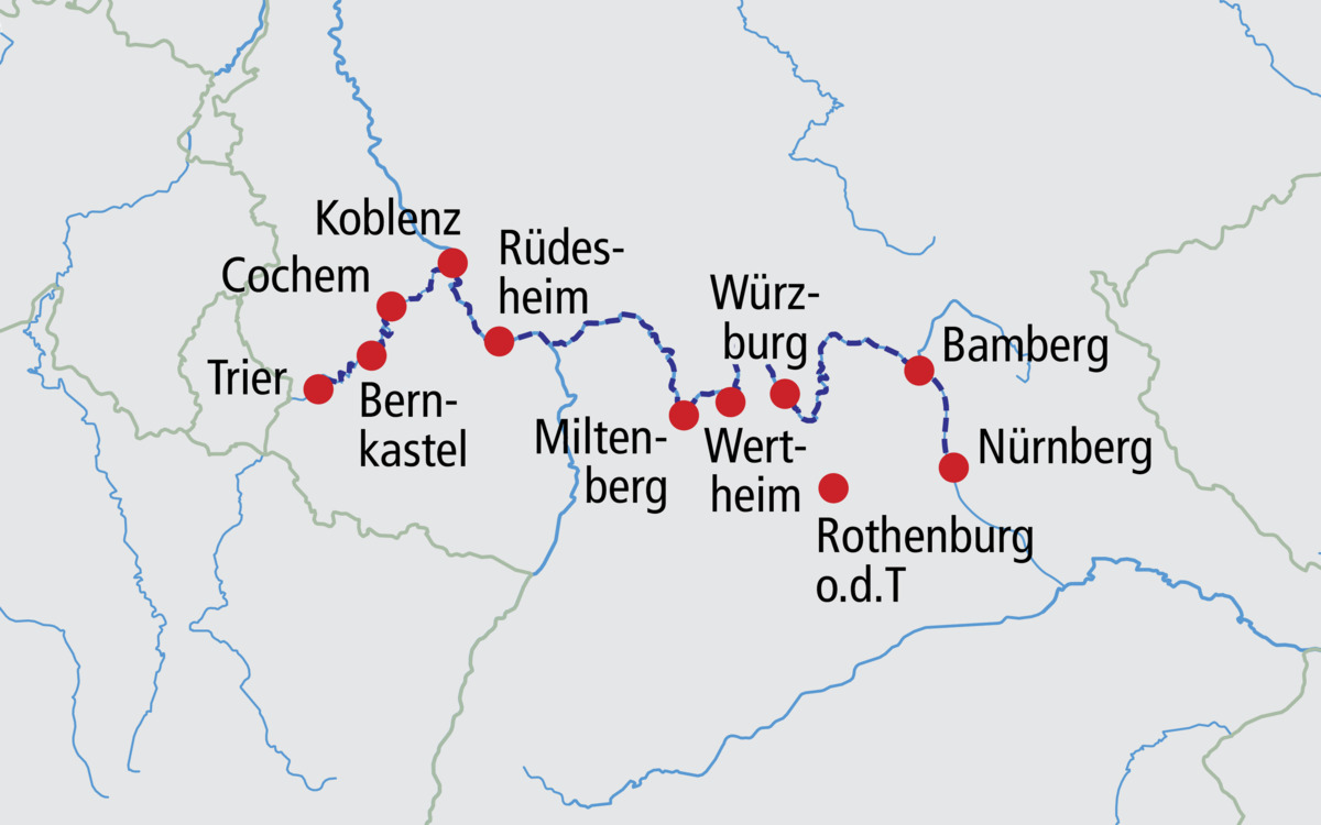 Flusslandschaften wie aus dem Bilderbuch, historische Städte und Ortschaften, Wein und Fachwerk erwarten Sie auf dieser Flusskreuzfahrt, die Sie von Nürnberg über Bamberg, Würzburg und Wertheim an den Rhein führt. Entlang des Rheins machen Sie Station im malerischen Rüdesheim und in Koblenz am Deutschen Eck und auf der Mosel lernen Sie die pittoresken Winzerortschaften Cochem und Bernkastel kennen.