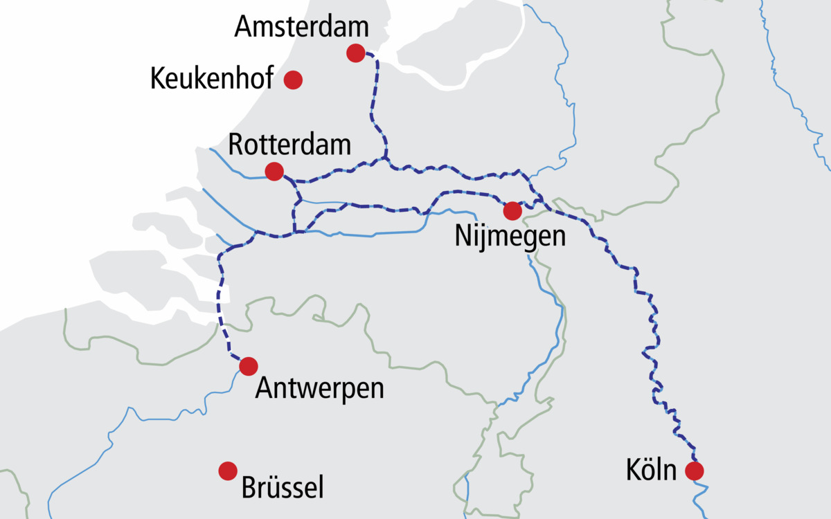 Erleben Sie die Tulpenblüte in Holland und lernen Sie die Metropole Amsterdam mit ihren zahlreichen Baudenkmälern kennen. Die Europastadt Brüssel beeindruckt mit weltbekannten Sehenswürdigkeiten und die Diamantenstadt Antwerpen mit der Liebfrauenkathedrale. Genießen Sie die Blumenpracht im Keukenhof und die gemütliche Atmosphäre der ehemaligen Hansestadt Nijmegen.