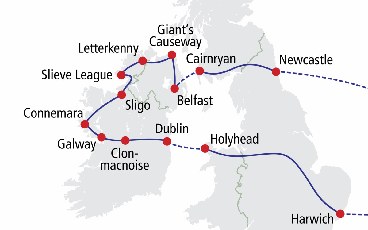 Sie verlassen Irland und setzen zunächst mit der Fähre nach Holyhead über. Von hier aus geht es nach Harwich, von wo aus Sie am späten Abend Kurs auf Holland nehmen.
