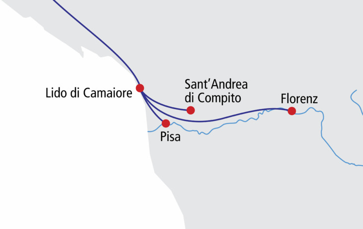 Die Küste der Toskana und besonders die Etruskerküste gelten als ein Paradies. Gründe dafür sind die herrlichen Strände und grünen Pinienwälder sowie eine Landschaft reich an Olivenhainen, Obstbäumen und den ältesten Kamelien Italiens. In Sant'Andrea di Compito bewundern Sie die baumhohen Kamelien. Die brachten einst die Luccheser Händler von fernen Handelsreisen mit, die über die Seidenstraße bis nach China führten. Zu den Reiseerlebnissen gehören kunsthistorische Attraktionen, an die in den Sommermonaten wegen zu großer Warteschlangen gar nicht zu denken ist. Sie besuchen die Uffizien und am Platz der Wunder in Pisa die Innenräume von Dom, Baptisterium und Camposanto.