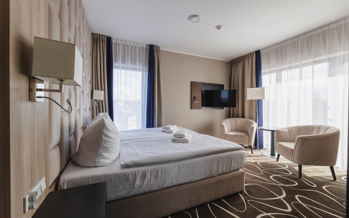 Sie wohnen im 4-Sterne-Haus "sun & sea" des Hotels Trofana (Eröffnung des Anbaus 2019). Das Hotel liegt ruhig und doch zentral in zweiter Reihe. Zur Promenade und Seebrücke sind es nur 200 m, zum Zentrum 80 m. Die komfortablen Zimmer sind mit Klimaanlage, Wasserkocher, Safe, TV, Sessel, Telefon, Balkon und Dusche/WC ausgestattet. Im angrenzenden, verbundenen Hauptgebäude befinden sich ein Restaurant, eine Bar, ein Wellnessbereich mit Sauna, Schwimmbad und Whirlpool sowie der Kur-/ Massage-/ und Beautybereich.