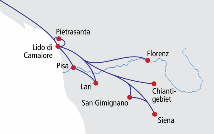 Im benachbarten Pietrasanta besuchen Sie das Museo dei Bozzetti. Dort beeindrucken hunderte von Skulpturen, die von mehr als 350 Künstlern an der Versiliaküste erschaffen wurden. Anschließend durchfahren Sie eine Gegend, reich an Olivenhainen und Weinreben und kehren auf einem Landgut ein, um die Herstellung des Olivenöls, das aus dem Fruchtfleisch der Oliven gepresst wird, mitzuerleben. Genießen Sie das edelste Öl, eines der Qualität Extra Vergine, wenn Sie bei einer Mittagsvesper mit Bruschetta, Wein und Oliven die Öle probieren.