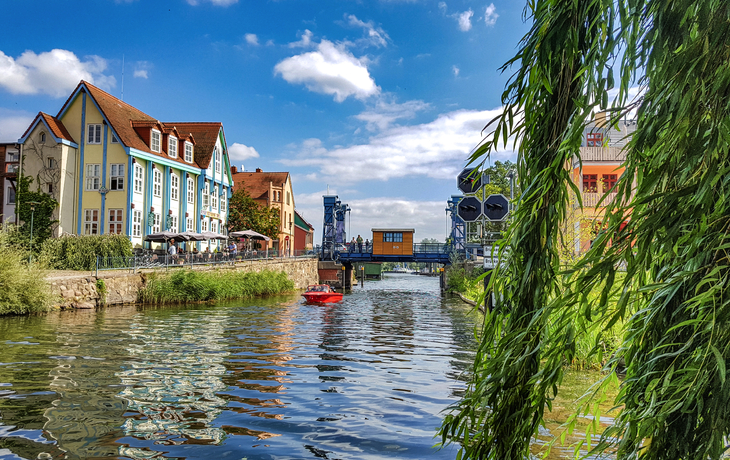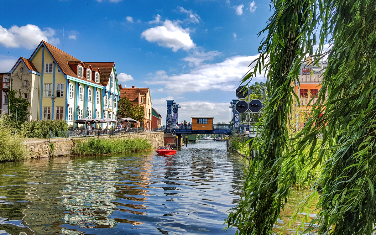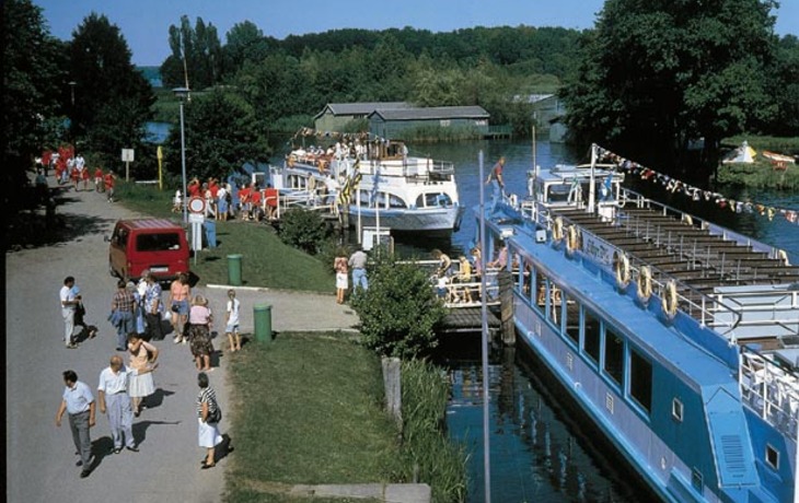 Mit dem Fahrgastschiff der Blau Weißen Flotte geht es von Malchow über fünf Seen und durch zwei Kanäle in das Heilbad Waren. An der Kietzbrücke startet ein Rundgang durch die romantische Warener Altstadt.