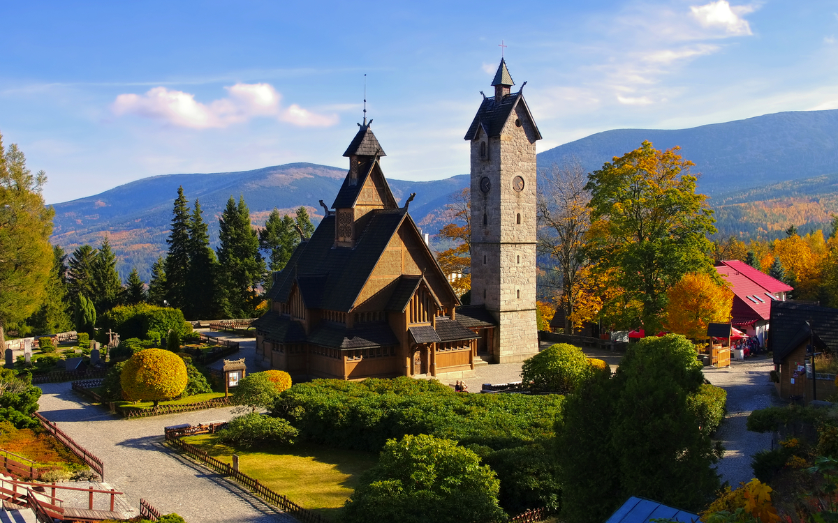 Zu den Attraktionen im Riesengebirge gehören die Stabkirche Wang, die in Norwegen erbaut, vor etwa 150 Jahren auf abenteuerlichen Wegen nach Karparcz kam, und Haus Wiesenstein in Agnetendorf, in dem ein Museum an den Nobelpreisträger Gerhard Hauptmann und seinen Bruder Carl erinnert, der hier das „Rübezahl-Buch" schrieb. Anschließend geht es zum Kochelfall, der Inspiration Carl Hauptmanns für die Erfindung des Waldgeistes war und der zweitgrößte Wasserfall des polnischen Teils des Riesengebirges ist. Nach einem kurzen Waldspaziergang erreichen Sie den Wasserfall.
