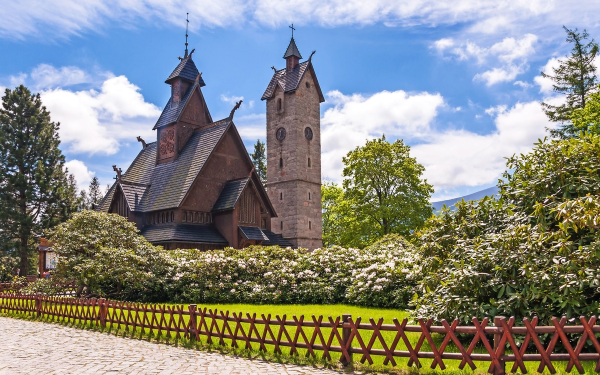 Zu den Attraktionen im Riesengebirge gehören die Stabkirche Wang, die in Norwegen erbaut, vor etwa 150 Jahren auf abenteuerlichen Wegen nach Karparcz kam, und Haus Wiesenstein in Agnetendorf, in dem ein Museum an den Nobelpreisträger Gerhard Hauptmann und seinen Bruder Carl erinnert, der hier das „Rübezahl-Buch" schrieb. Anschließend geht es zum Kochelfall, der Inspiration Carl Hauptmanns für die Erfindung des Waldgeistes war und der zweitgrößte Wasserfall des polnischen Teils des Riesengebirges ist. Nach einem kurzen Waldspaziergang erreichen Sie den Wasserfall.