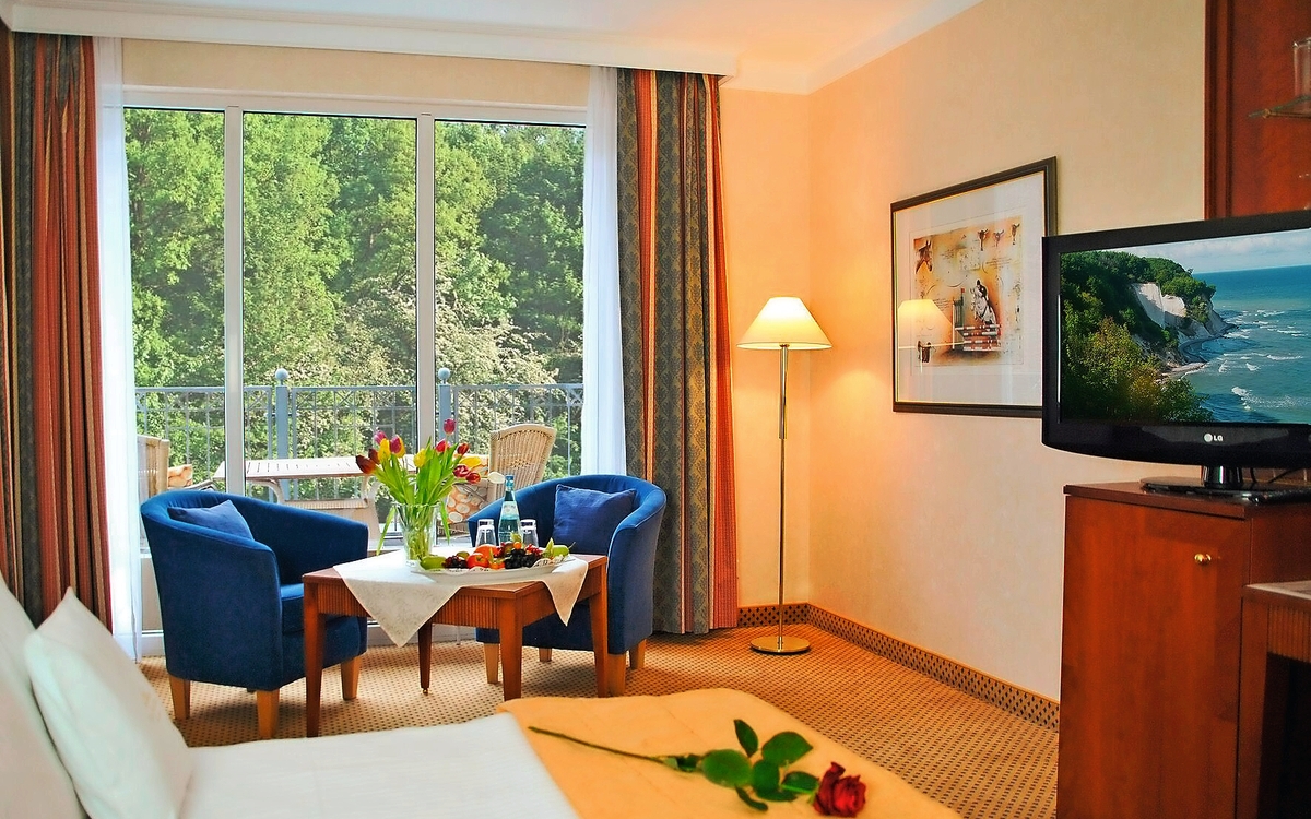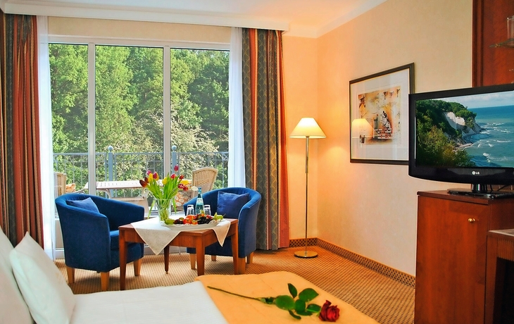 Das 5-Sterne-Wellnesshotel im traditionellen Bäderstil liegt am ruhigsten Teil der Strandpromenade von Binz, umgeben von historischen Villen und den Buchenwäldern der Granitz. Die komfortablen Zimmer zur Landseite haben einen Balkon und sind mit Bad oder Dusche/WC, Haartrockner, Bademantel, Flachbildfernseher, Sky-TV, Telefon und Safe ausgestattet. Kulinarisch verwöhnt Sie das Restaurant Ruiani, Cocktails genießen Sie in der Bar Shaker's. Entspannung bietet das über 750 m² große Well Being & Beauty Spa mit Schwimmbad, drei Saunen und Fitnessraum.