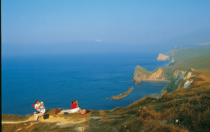 Auch heute bereisen Sie einen wunderschönen Küstenabschnitt mit unberührter Natur. Die Jurassic Coast, die über 200 Millionen Jahre alt ist und dem Zeitalter des Jura zugerechnet wird und sich etwa 150 Kilometer von Old Harry Rocks in der Studland Bay in Dorset bis nach Exmouth in East Devon erstreckt, wurde als erste Naturlandschaft in England zum UNESCO-Welterbe erklärt. Sie ist berühmt für zahlreiche Fossilienfunde, darunter prähistorische Bäume und gigantische Meeressaurier, und dem Brandungstor von Durdle Door, eine ihrer meistfotografierten Sehenswürdigkeiten, die Sie auf einem Spaziergang von der schönen Bucht von Lulworth Cove oder der Man of War Beach aus erreichen können. Sie kommen zu den spektakulären Ruinen von Corfe Castle und besuchen Weymouth und Abbotsbury.