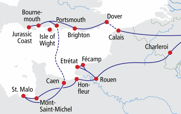 Für Liebhaber von spektakulären Küstenlandschaften gibt es nichts Schöneres, als die vielfältigen, von Wind und Meer geprägten Küsten Südenglands und Nordfrankreichs zu bereisen. Sie durchfahren die grünen Hügel der Downs, die als „Garden of England“ bekannt sind, kommen im Süden von Wessex zu den sanft gewellten Kreideebenen und üppigen Flusstälern, die mit lebhaften Badeorten wie Brighton und den windumtosten Kreideküsten kontrastieren. Ebenso eindrucksvoll sind die Côte d’Émeraude in der Bretagne, die in der Bucht von Mont-Saint-Michel dem Rhythmus der ausgeprägtesten Gezeiten Europas folgt, und die normannische Côte d'Albâtre mit ihren über 100 m hohen Steilklippen, die atemberaubende Aussichten auf die Küste und das Meer bieten. Hinzu kommen die Fährüberfahrten in frischer Seeluft nach Dover und Caen, Schiffsausflüge auf die Inseln Wight und Jersey sowie Rundgänge in historischer Kulisse von Saint-Malo und Rouen.
