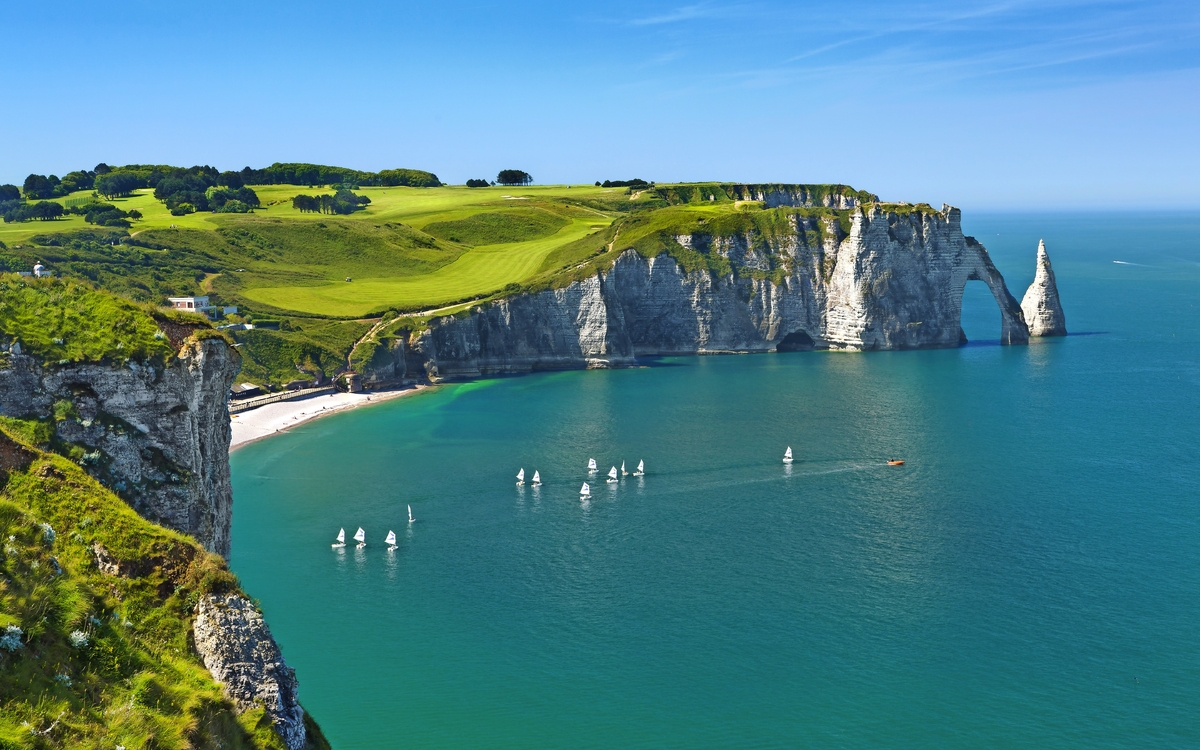 Tauchen Sie ein in die wilde Schönheit der normannischen Küste, wenn Sie die schönsten Kreidefelsen der Alabasterküste in der Normandie entdecken. Die Klippen mit dem Felsentor und seiner gigantischen l’Aiguille Creuse, die fast 90 Meter hoch ist, haben den Badeort Étretat mit schöner Strandpromenade weltberühmt gemacht und große Maler wie Turner, Boudin, Monet und viele andere inspiriert. Der höchste Punkt jedoch ist Cap Fagnet, das auf 110 Metern über dem Meeresspiegel gelegen, ein beeindruckendes Panorama über Fécamp, das Meer und die weiße Steilküste bietet.