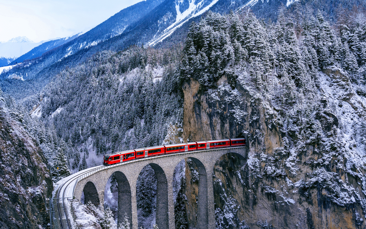 Eine Fahrt mit dem Bernina-Express, der auf der höchsten Bahntrasse der Alpen fährt, zählt zu den schönsten Bahnausflügen in der Schweiz und beeindruckt immer wieder aufs Neue. Die Strecke ist ein Meisterwerk der Ingenieurkunst, die sich harmonisch in die grandiose Gebirgswelt einfügt. Freuen Sie sich auf ein einzigartiges UNESCO-Welterbe, das auch Ihr Herz höher schlagen lässt, und genießen Sie atemberaubende Aussichten auf verschneite Gletscher. Die Route führt von Tiefencastel durch das Albulatal nach Samedan ins Engadin und weiter nach Tirano in Italien. Rückfahrt mit dem Bus über den Bernina- und Julierpass.