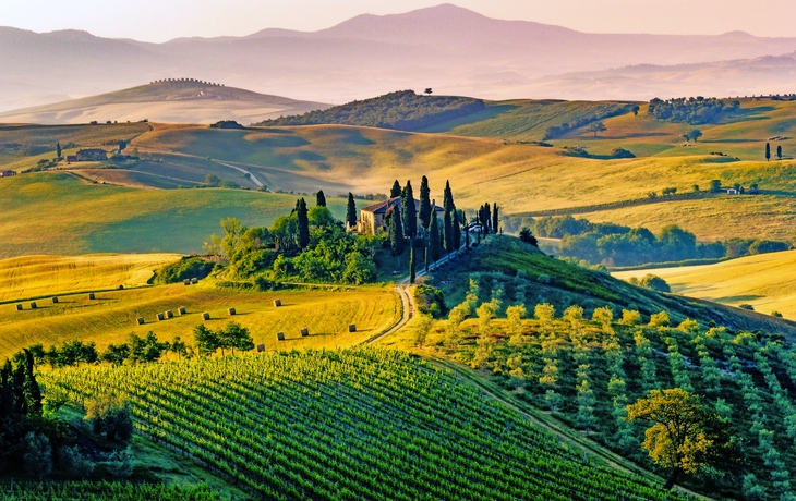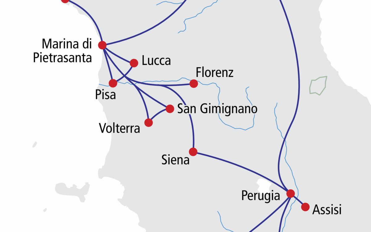 Die sanfte Hügellandschaft samt traumhaft schön gelegener Städte und Orte macht den Reiz und die Faszination der Toskana aus. Erleben Sie auf dieser Reise eine Fülle kunsthistorischer Höhepunkte, die Etrusker, Kelten und Römer hinterlassen haben und genießen Sie die von Pinien und Zypressen gesäumte Landschaft dieser großartigen Region. Mit Florenz, Pisa und Siena entdecken Sie einige der schönsten Städte der Toskana sowie mit Perugia und Assisi die Schätze Umbriens.