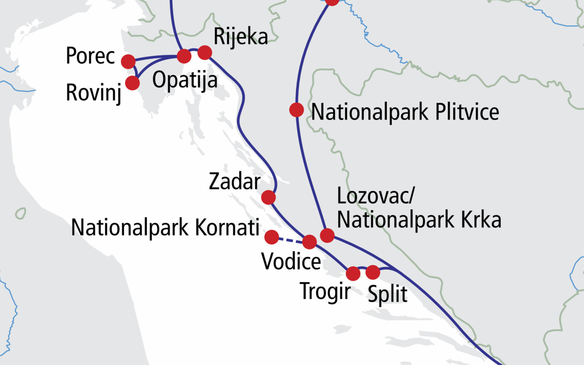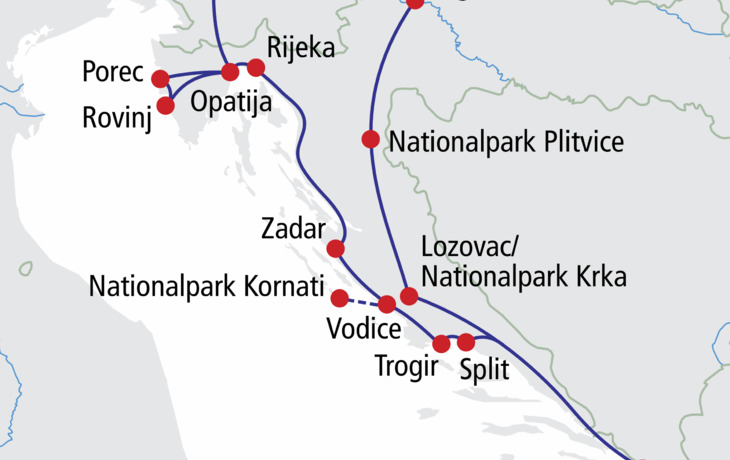 Kroatien ist traumhaft - wer schon einmal da war, wird dieser Aussage zustimmen. Freuen Sie sich bei dieser Rundreise auf Natur und Kultur. Beginnend mit der lebendigen Hauptstadt Zagreb bereisen Sie zwei der berühmtesten Nationalparks Europas, sehen das geschichtsträchtige und zauberhafte Dubrovnik sowie bekannte Städte wie Split und Trogir und genießen die herrliche Inselwelt bei einem Schiffsausflug. Den Abschluss der Reise bildet Istrien mit dem mondänem Seebad Opatija und den bekannten Städten Rovinj und Porec.