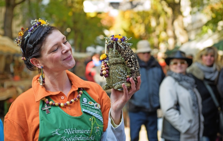 Erleben Sie den Weimarer Zwiebelmarkt, das älteste und größte sowie überregional bekannteste Volksfest Thüringens. Folkloristische Marktstände und ein buntes Bühnenprogramm verleihen Weimar eine einzigartige Atmosphäre, wenn die Zwiebelbauern aus dem nordthüringischen Heldrungen, die Mittelpunkt des Weimarer Marktes sind, ihre kunstvoll geflochtenen Zwiebelzöpfe feil bieten und es überall nach Weimarer Zwiebelkuchen duftet. Ein weiteres Erlebnis wartet in Eisenach, wo es im Rahmen einer Führung durch tausend Jahre Wartburg-Geschichte geht. Sie logieren in der Residenzstadt Gotha.